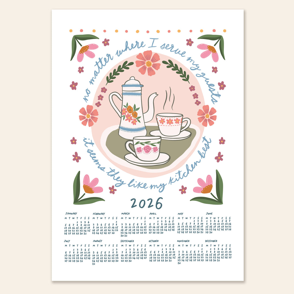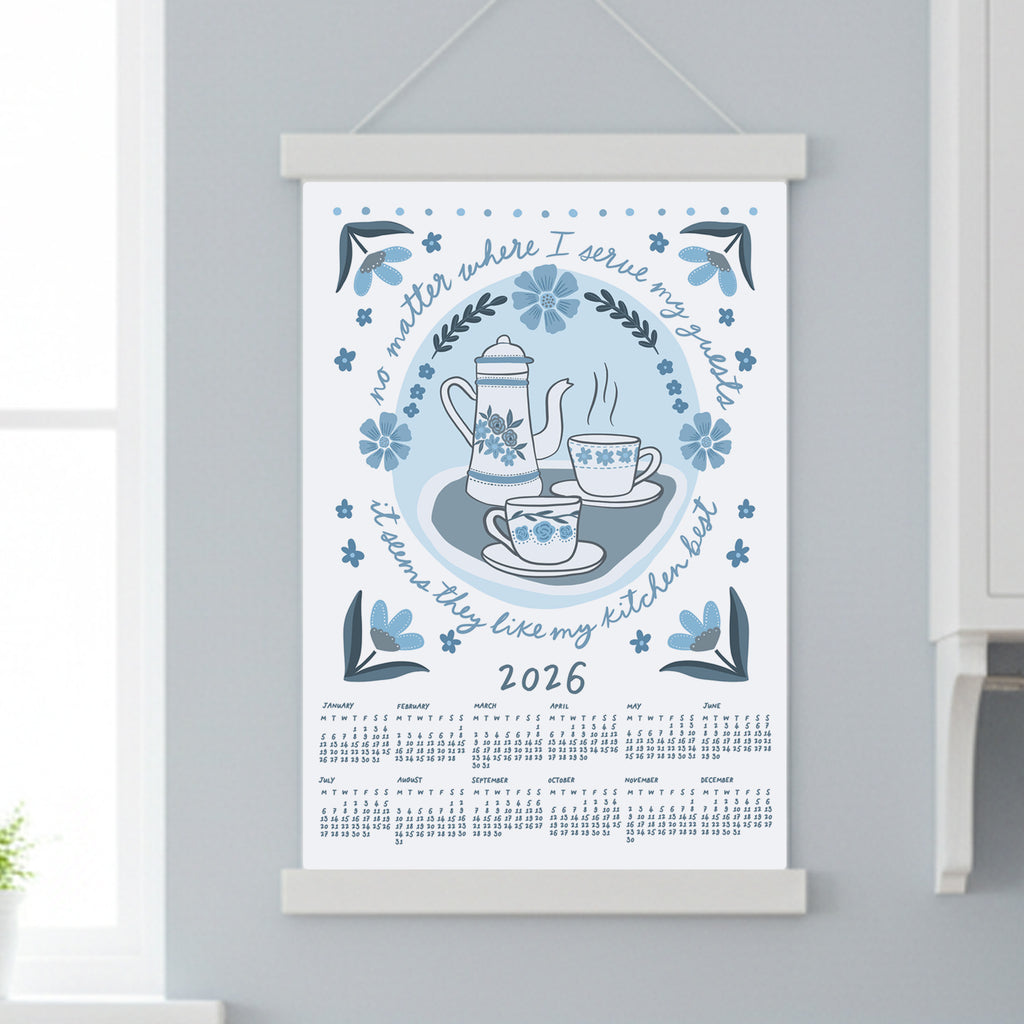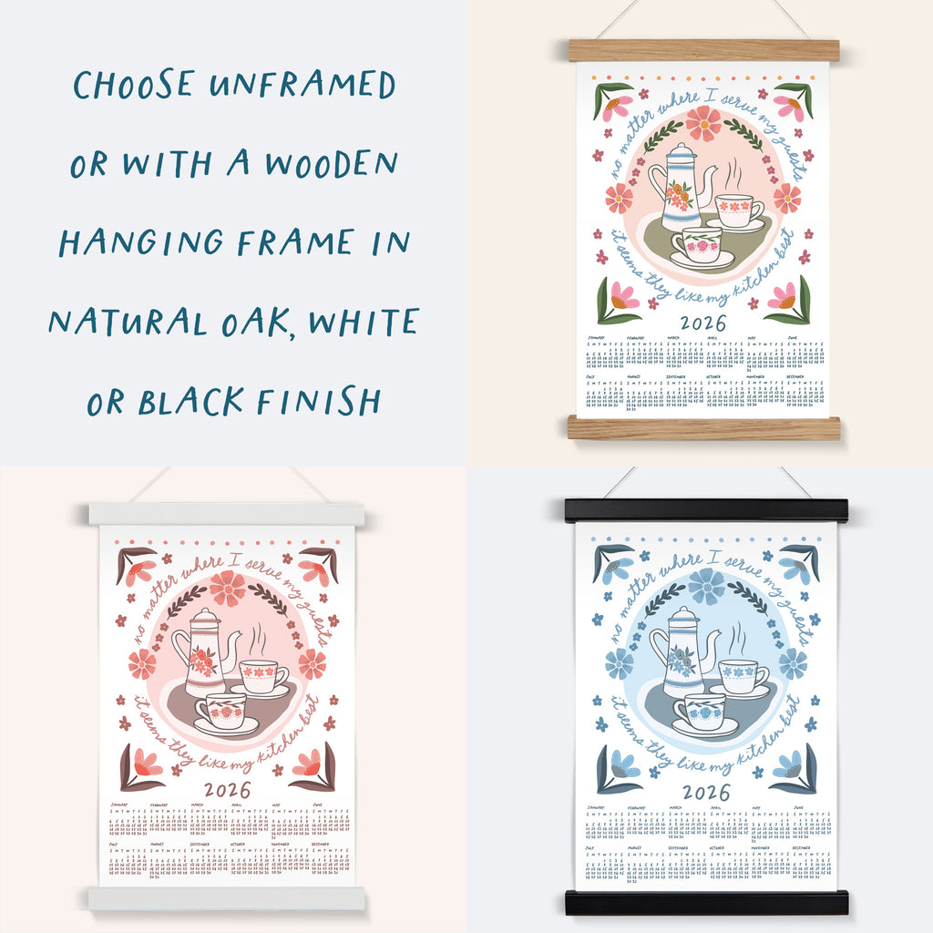 "No matter where I serve my guests, it seems they like my kitchen best" 2026 wall calendar. Featuring hand drawn illustrations and hand lettering, this cute calendar will brighten up any kitchen. Available in four colourways, choose from A3 or A4 size and whether you'd like it unframed or with your choice of wooden hanging frame.