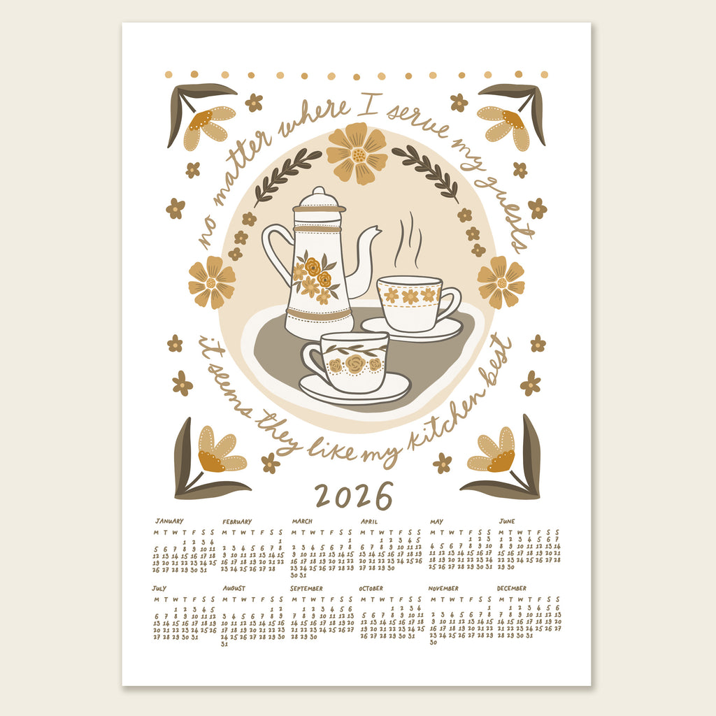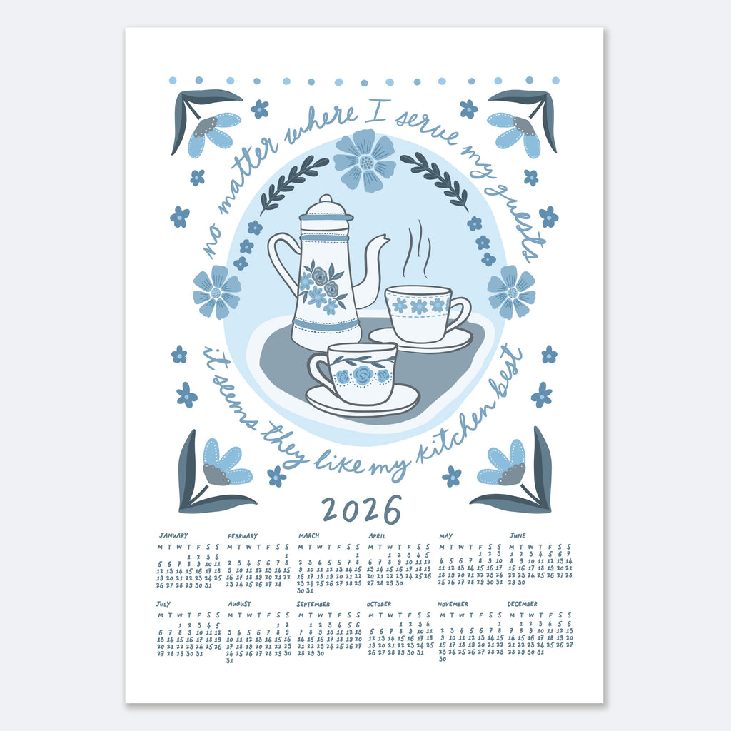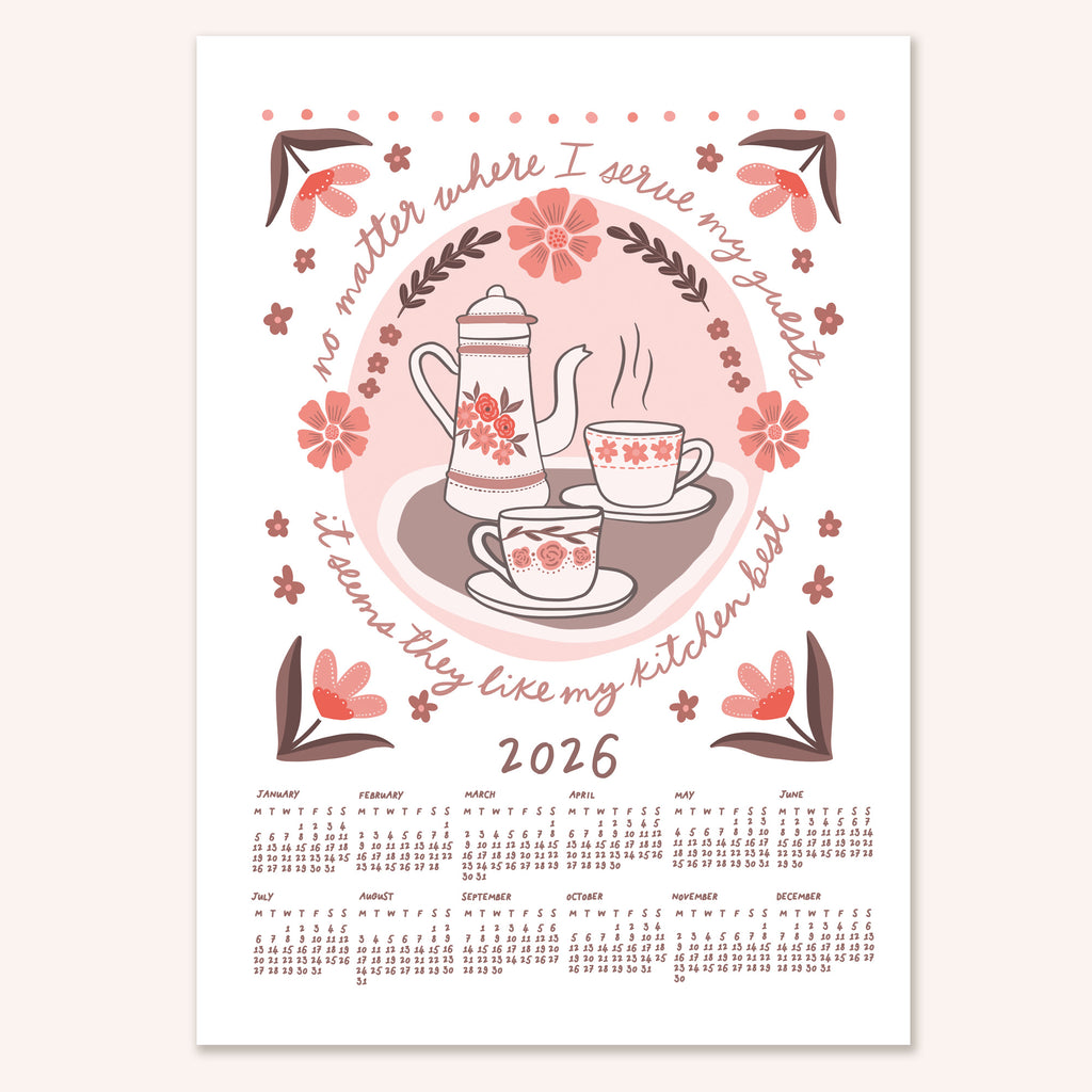 "No matter where I serve my guests, it seems they like my kitchen best" 2026 wall calendar. Featuring hand drawn illustrations and hand lettering, this cute calendar will brighten up any kitchen. Available in four colourways, choose from A3 or A4 size and whether you'd like it unframed or with your choice of wooden hanging frame.