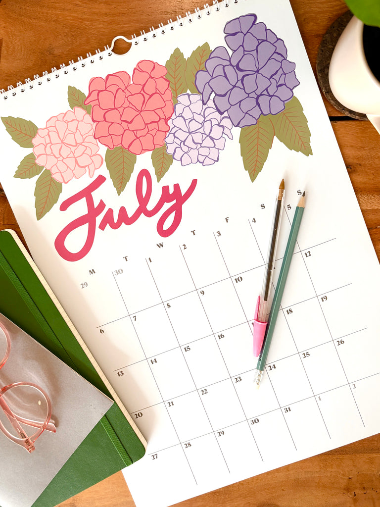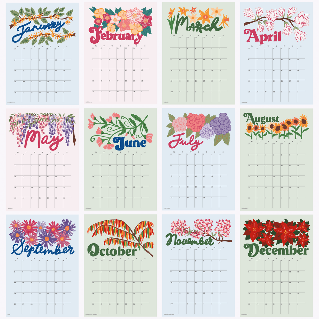 Featuring beautiful hand drawn flowers and botanicals, this 2026 A3 hanging wall calendar will add colour to your walls. Inspired by the flowers found each month in an English garden, each monthly page has a unique, vintage inspired illustration and hand lettering. Each date box is a large size, (3.5 x 4.5cm) perfect for adding your appointments and birthdays.
